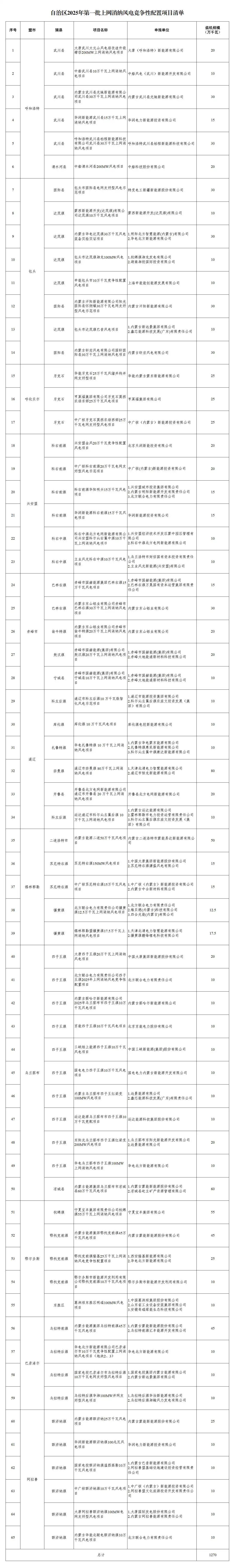 公告显示,2025年第一批上网消纳风电项目共65个,容量总计1270万千瓦。