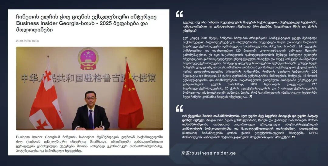 “近两年,中格企业合作逐步从传统的基建领域向成套设备、高科技领域发展。金风科技正在参与哥里市(Gori)的瑞思(Ruisi)风力发电项目……总装机容量206MW,包括33台风力发电机组的供货、安装及15年运营维护……在“双碳”目标下,双方在新能源、储能、电网升级等领域合作潜力巨大。”——中国驻格鲁吉亚大使周谦于本月20日接受《商业内幕-格鲁吉亚》新闻网站采访