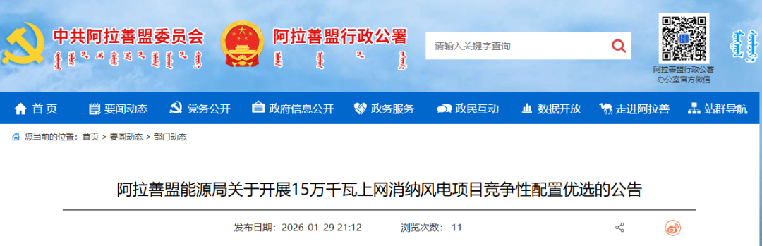 1月29日,《阿拉善盟能源局关于开展15万千瓦上网消纳风电项目竞争性配置优选的公告》发布。