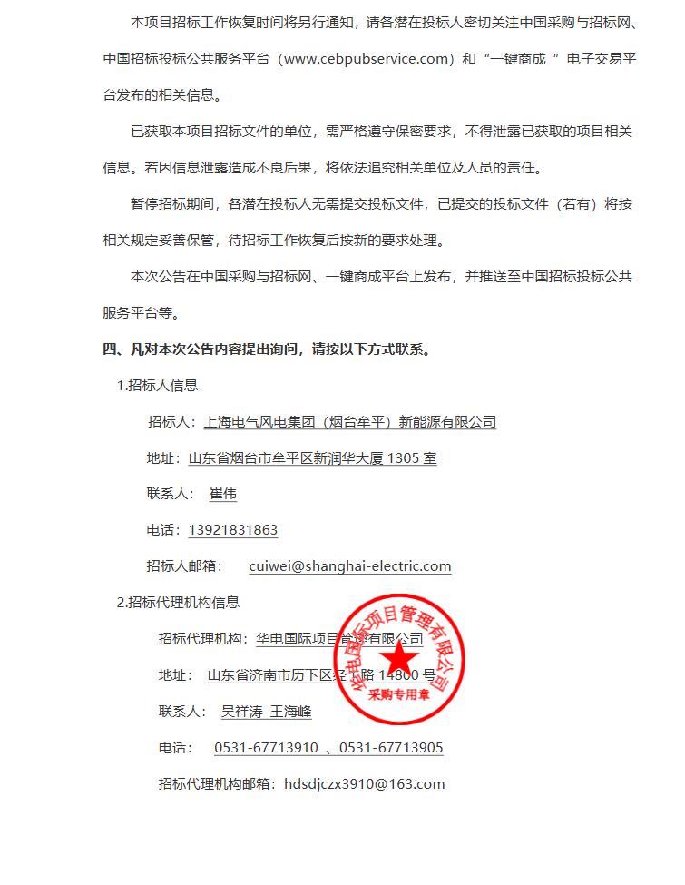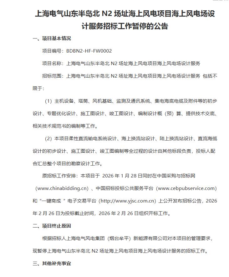 近日,中国招标投标公共服务平台发布《上海电气山东半岛北N2场址海上风电项目海上风电场设计服务招标工作暂停的公告》。
