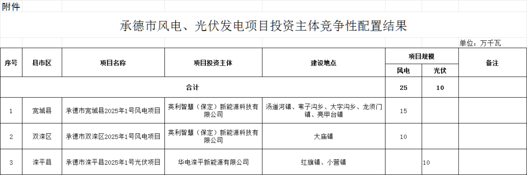 2月2日,承德市发展和改革委员会发布《关于承德市风电、光伏发电项目投资主体竞争性配置结果的公示》。