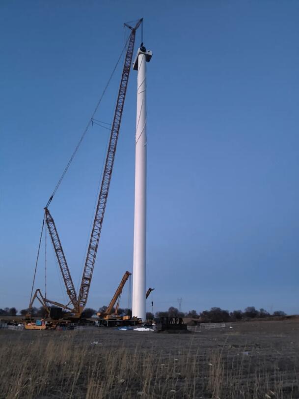 项目所在地吉林省通榆县冬季严寒,最低气温可达-30℃,加之风速波动大、地形复杂,给风机吊装作业带来了精度控制难、设备防冻要求高、安全风险大等多重挑战。为确保工程高质量推进,项目团队成立专项技术攻坚组,历时三个月开展多轮地质勘测与技术论证,创新制定了“精准勘测定机位、分段施工控节奏、实时监测保安全”的专项施工方案。施工期间,团队采用“1000吨级履带吊车+汽车吊”协同吊装工艺,并依托气象专属数据服务与智能监控平台,实现对风速、温度、吊装角度等关键参数的实时预警与动态调整,最终圆满完成了全部风机吊装任务,实现了“零安全事故、零质量偏差”的目标。