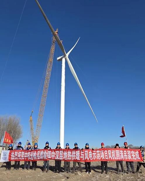 1月31日,随着最后一组风机叶片与轮毂在高空精准对接,由中核二二承建的中核通榆县瞻榆镇中深层地热供暖与风电示范项目,顺利完成全部12台风电机组的吊装工作。