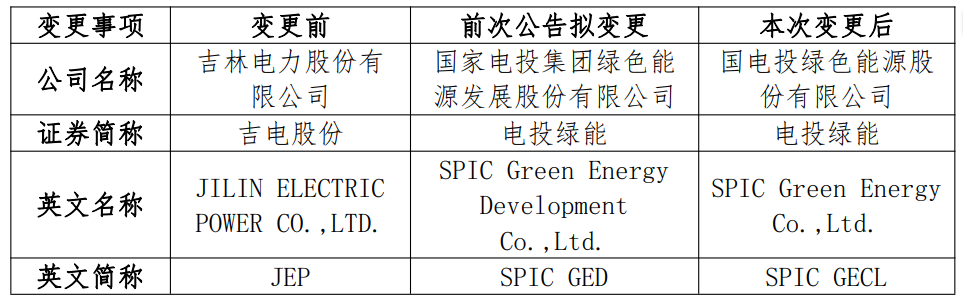 2月3日,国电投绿色能源股份有限公司发布公告,宣布“吉林电力股份有限公司”正式更名为“国电投绿色能源股份有限公司”,证券简称于2月4日由“吉电股份”变更为“电投绿能”,英文简称从“JEP”调整为“SPICGECL”,证券代码“000875”不变。2月4日,国投绿能正式举办了揭牌签约活动。